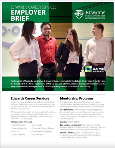 We look forward to partnering and supporting you with your hiring needs, and have a variety of services available to you – all at no charge.* Our dedicated staff are available to assist you with targeting the right students, promoting your events, and building your brand. Interested in more information? Contact us at careers@edwards.usask.ca.